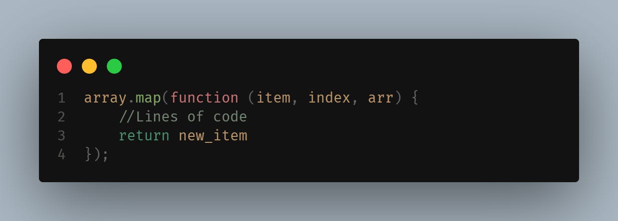 item- It’s a required parameter, the value of the current array item.index- Optional, It’s the current index of the array element that is being processed.arr- Optional, the array on which themap()method was called.