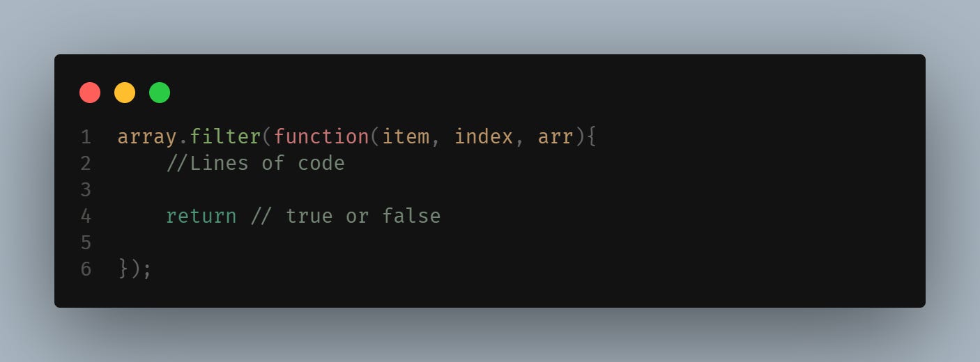 item- It’s a required parameter, the value of the current array item.index- Optional, It’s the current index of the array element that is being processed.arr- Optional, the array on which thefilter()method was called.