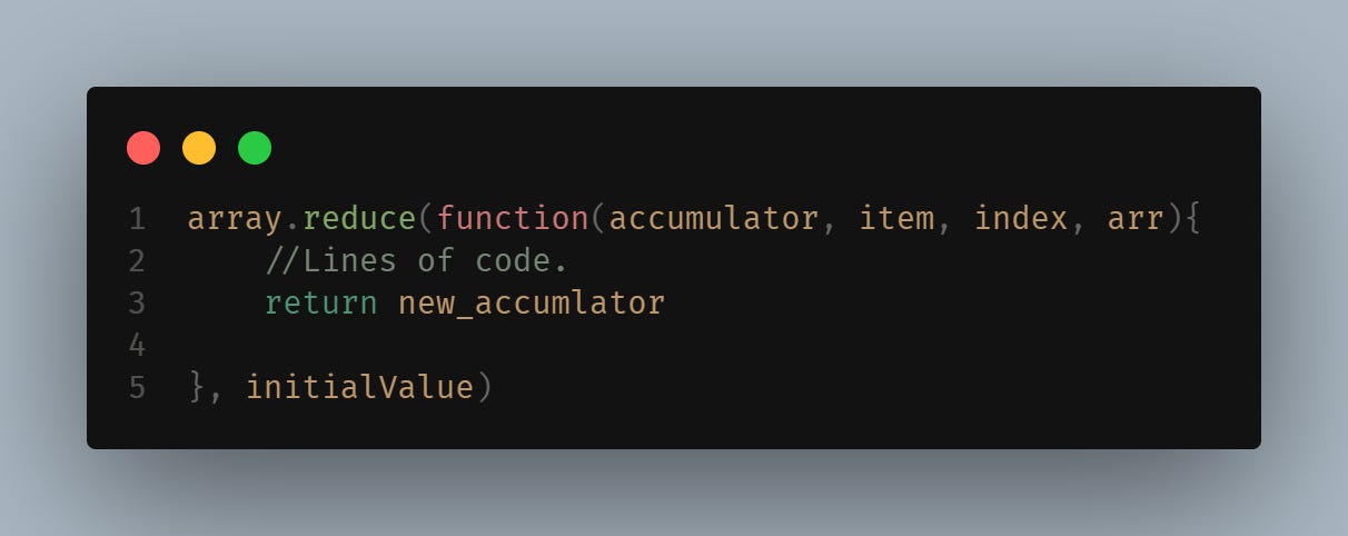 item- It’s a required parameter, that is the value of the current item of the array.index- Optional, it’s the current index of the array element that is being processed.arr- Optional, the array on which thereduce()method was called.InitialValue- Optional, it’s a starting value that is used to initialize the callback function for the first time.